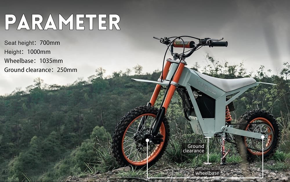| Especificación | Marco: aleación de aluminio Motor (nominal/pico): 1500w, 3000w Batería: 48 V 21 Ah Carga: 7-8 horas Velocidad máxima: 45-55 km/h (24,8-34 mph) Alcance: 40-50 km Carga máxima: 120 kg (265 lb) Neumático (delantero/trasero): 14 pulgadas / 12 pulgadas Freno: Freno hidráulico Suspensión delantera: Suspensión hidráulica Suspensión trasera: Amortiguador hidráulico de nitrógeno y aceite ajustable |